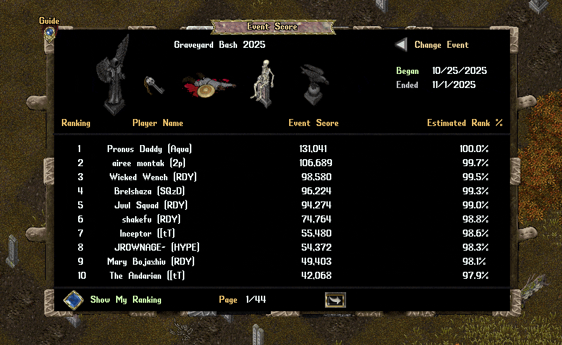 The Graveyard Bash draws to its eerie conclusion. Congratulations to Pronus Daddy for claiming the crown this year, clawing through more than 440 other brave souls to claim Graveyard supremacy. All rewards have been delivered directly into participant bank boxes.